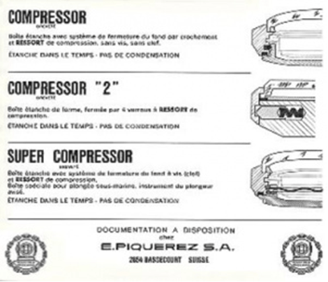 Enicar was among the earliest to adopt EPSA’s Compressor case, its first-edition Seapearl Ultrasonic employing a specially designed “EPSA-STOP” Compressor case. The Seapearl was introduced in 1955, the same year EPSA’s Compressor Swiss patent was issued (brevet 313813 for non-Enicar models); the Super Compressor followed in 1956 (brevet 337462 & 317537 for single and dual crown non-Enicar versions). Most Compressors and Super Compressors can be distinguished by the former’s use of snap-on and the latter’s use of screw-down case backs. Many Enicar Compressor and Super Compressor models, however, employ a unique bayonet-style case back tightening design for which EPSA obtained separate patents (brevet 98243 & 314962, respectively).