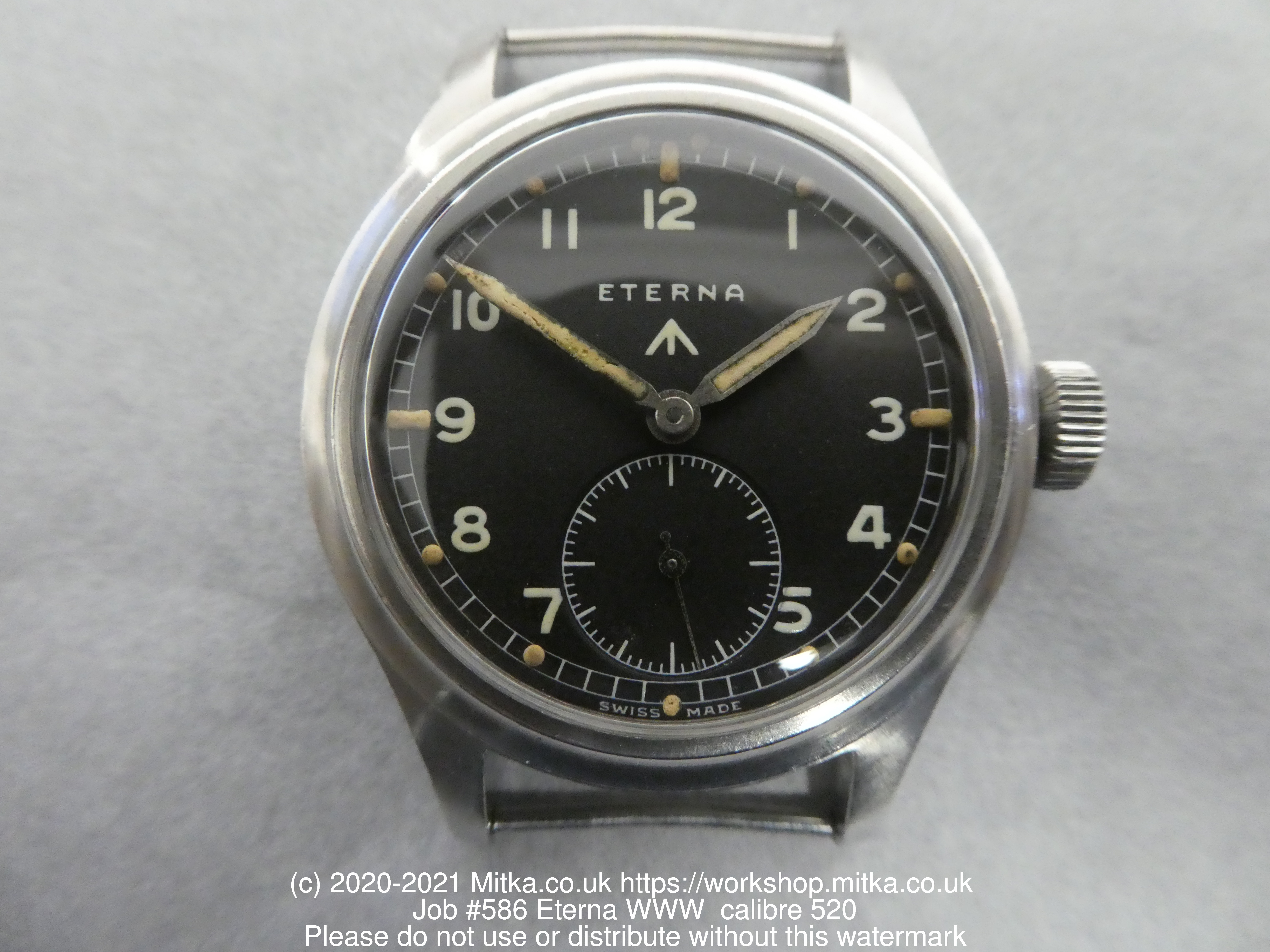 The MOD contracted with twelve watch companies to produce watches meeting this new design specification, including Buren, Cyma (Tavannes), Eterna, Grana (Certina), IWC, Jaeger LeCoultre, Lemania, Longines, Omega, Record, Timor and Vertex (Revue). These so-called “Dirty Dozen” watches can be recognized by the WWW stamp on the case, an abbreviation for the MOD’s “Watch, Wristlet, Waterproof” military design specification. The WWW spec required water and shock resistance, and a black dial with Arabic numerals and sub-seconds to enhance visibility. The Dirty Dozen watch dials displayed the “broad arrow” symbol, traditional marking for British military property.
